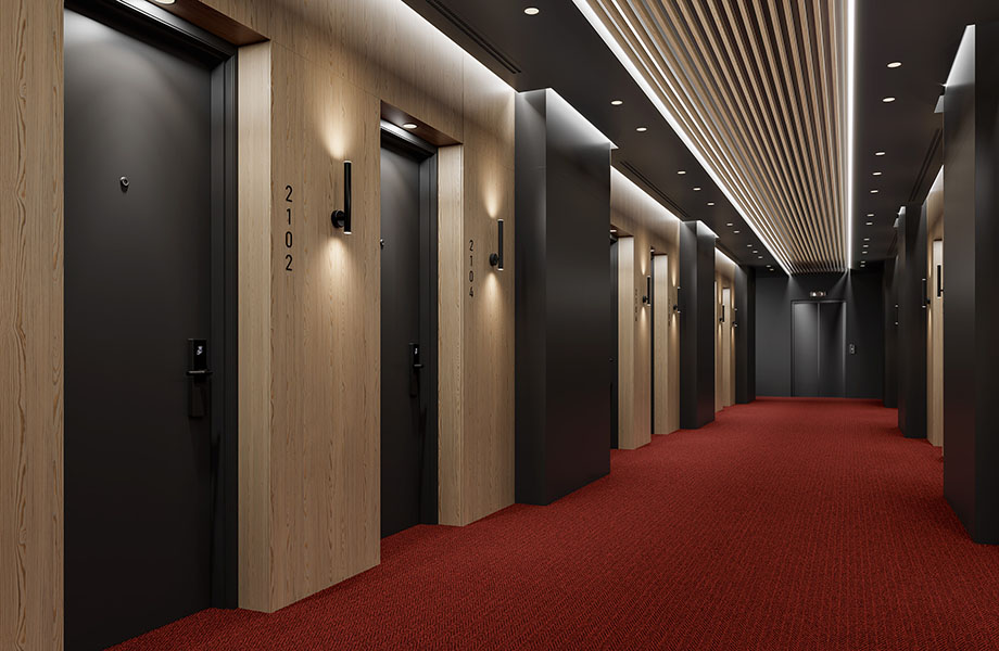 Formica® Door-kolleksjonen kan by på et bredt utvalg av farger, mønstre, tresorter og kreative overflater. Enten du har sansen for flotte farger eller foretrekker den naturlige skjønnheten til tre, kan Formica® High Pressure Laminate by på praktiske løsninger til innvendige dører. De iboende egenskapene gjør disse dørene ideelle for omgivelser med mye folk og regelmessig bruk, som i gjestfrihetsmiljøer.