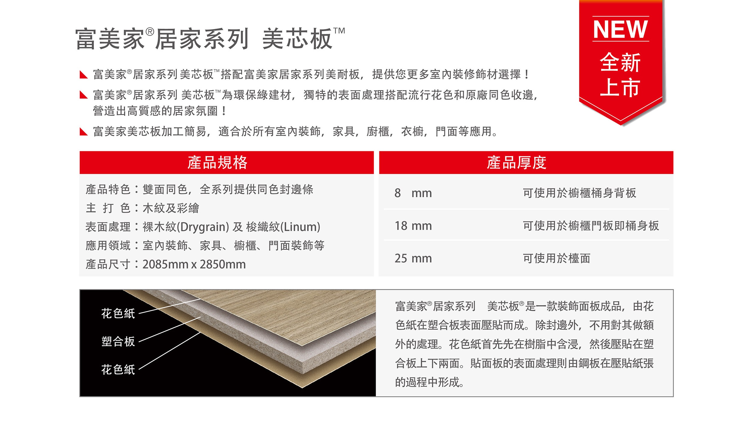富美家全系列產品將滿足您不同需求,兼具設計、功能性和花色搭配,滿足您的設計個性化需求,打造舒適、精緻的居家生活空間。